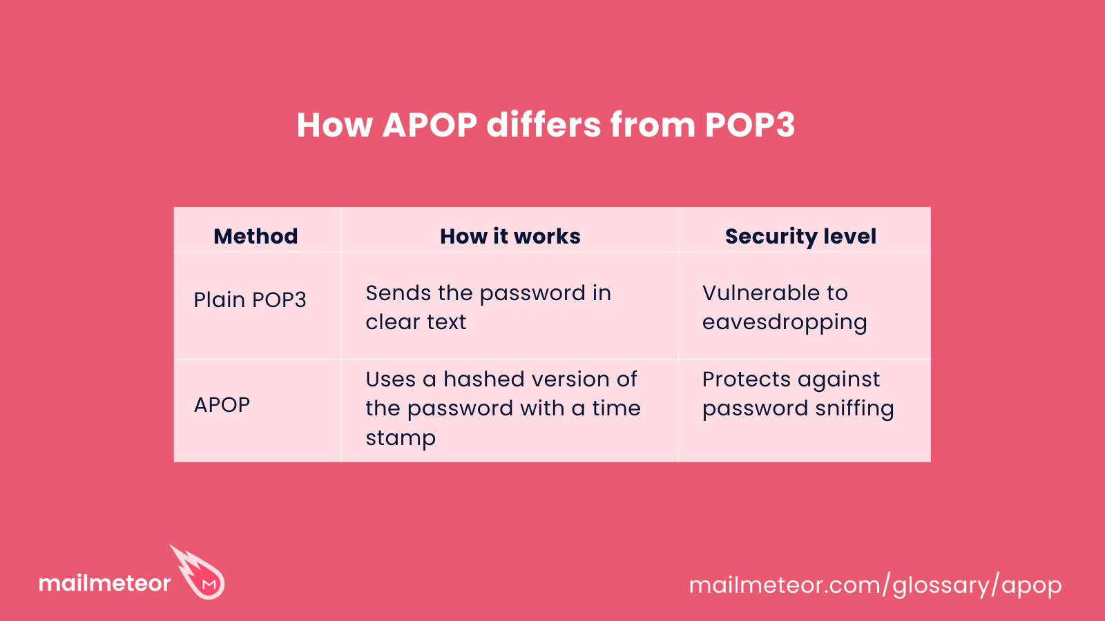 With standard POP3, when you check your email, your username and password are sent over the internet as plain text, making them vulnerable to hackers using network sniffing tools. APOP fixes this by encrypting your credentials before they are transmitted, preventing unauthorized access.